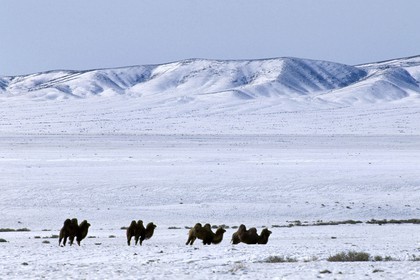 • Altai Mountains, Mongolia: Two humped domestic Bactrian camels, Camelus ferus bactrianus.