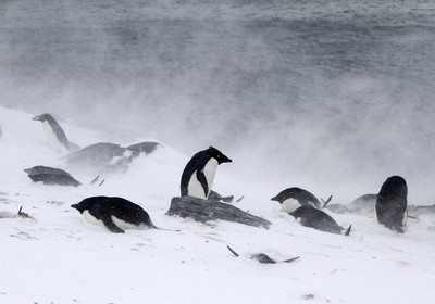 Nesting Adelie Penguins in a snowstorm. Shingle Cove, Coronation Island, South Orkneys. Antarctica