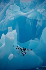 Chinstrap Penguins rest on a blue iceberg of ancient ice sculpted by the sea water, Antarctica
