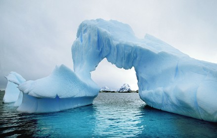 An iceberg with a natural arch in a bay on the Antarctic Peninsula.