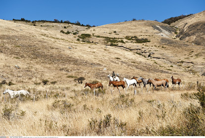 ARGENTINA / Patagonia / Santa Cruz / Los Glaciares Nationalpark / Estancia Nibepo Aike / Gaucho rounding up horses..© Oliver Bolch / Anzenberger Argentina, Patagonia