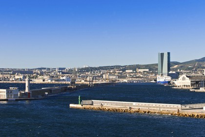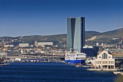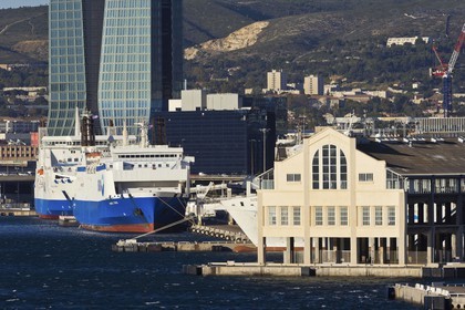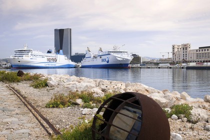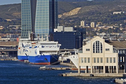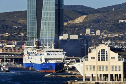 The ships of the SNCM company stationed in the Port Autonome de Marseille and CMA-CGM tower, Bouches du Rhone, France SNCM, French ship Company