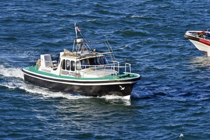 The speedboat with the driver of the ship in the Port Autonome de Marseille, Bouches du Rhone, France SNCM, French ship Company