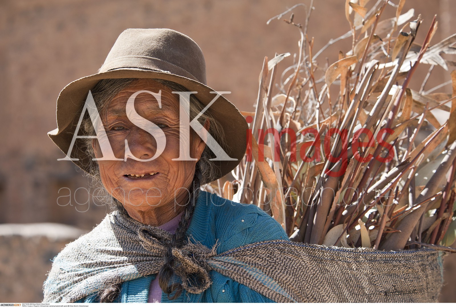 | Description | PERU / Cusco / Raqchi / Old woman carrying basket with grain..© Oliver Bolch / Anzenberger |