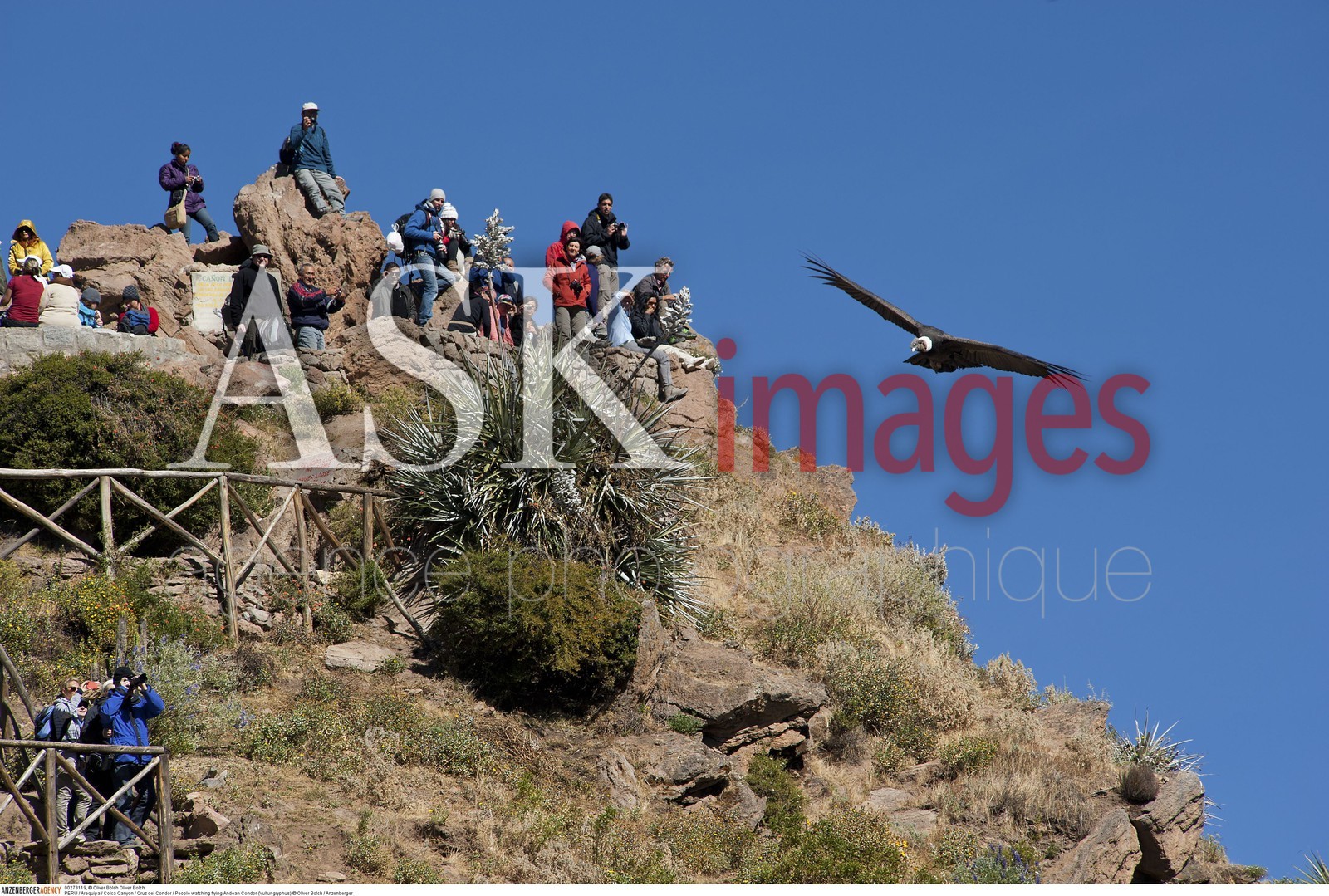 | Description | PERU / Arequipa / Colca Canyon / Cruz del Condor / People watching flying Andean Condor (Vultur gryphus)..© Oliver Bolch / Anzenberger |