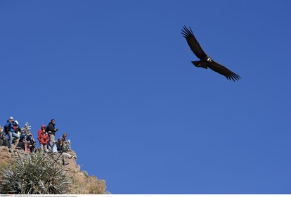 PERU / Arequipa / Colca Canyon / Cruz del Condor / People watching flying Andean Condor (Vultur gryphus)..© Oliver Bolch / Anzenberger Perou *** Peru