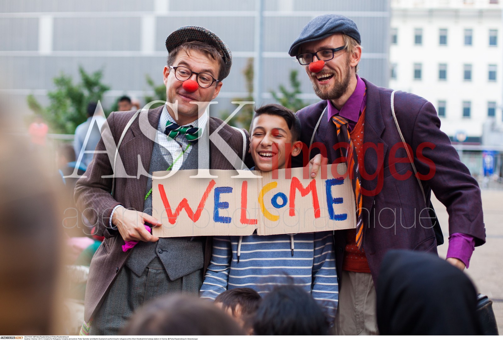 | Description | Austria / Vienna / 2015 / Clowns for Refugees / Clowns and actors: Peter Spindler and Martin Duskanich performing for refugees at the Wien Westbahnhof railway station in Vienna..© Petra Rautenstrauch / Anzenberger/ASK Images |