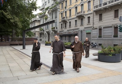 Franciscans crossing street, Milan, Italy