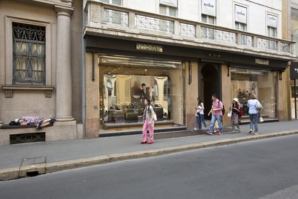 Via Montenapoleone in the mode district, chinese tourists and homeless, Milan, Italy
