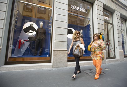 Chinese tourists shopping in mode district, Milan, Italy