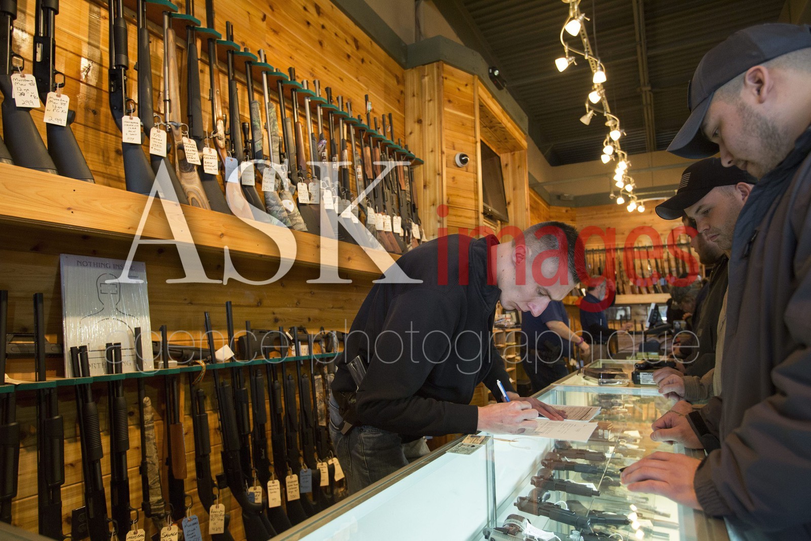 DescriptionMilford, Michigan - A worker looked over paperwork for a gun buyer's background check as customers crowded the Huron Valley Guns store on Gun Appreciation Day. Pro-gun groups gathered at gun stores across the nation to buy weapons and to oppose proposed limits on gun ownership. Assault weapons at this store were in such short supply that customers had to enter a lottery for the right to buy one..January 21 , 2013