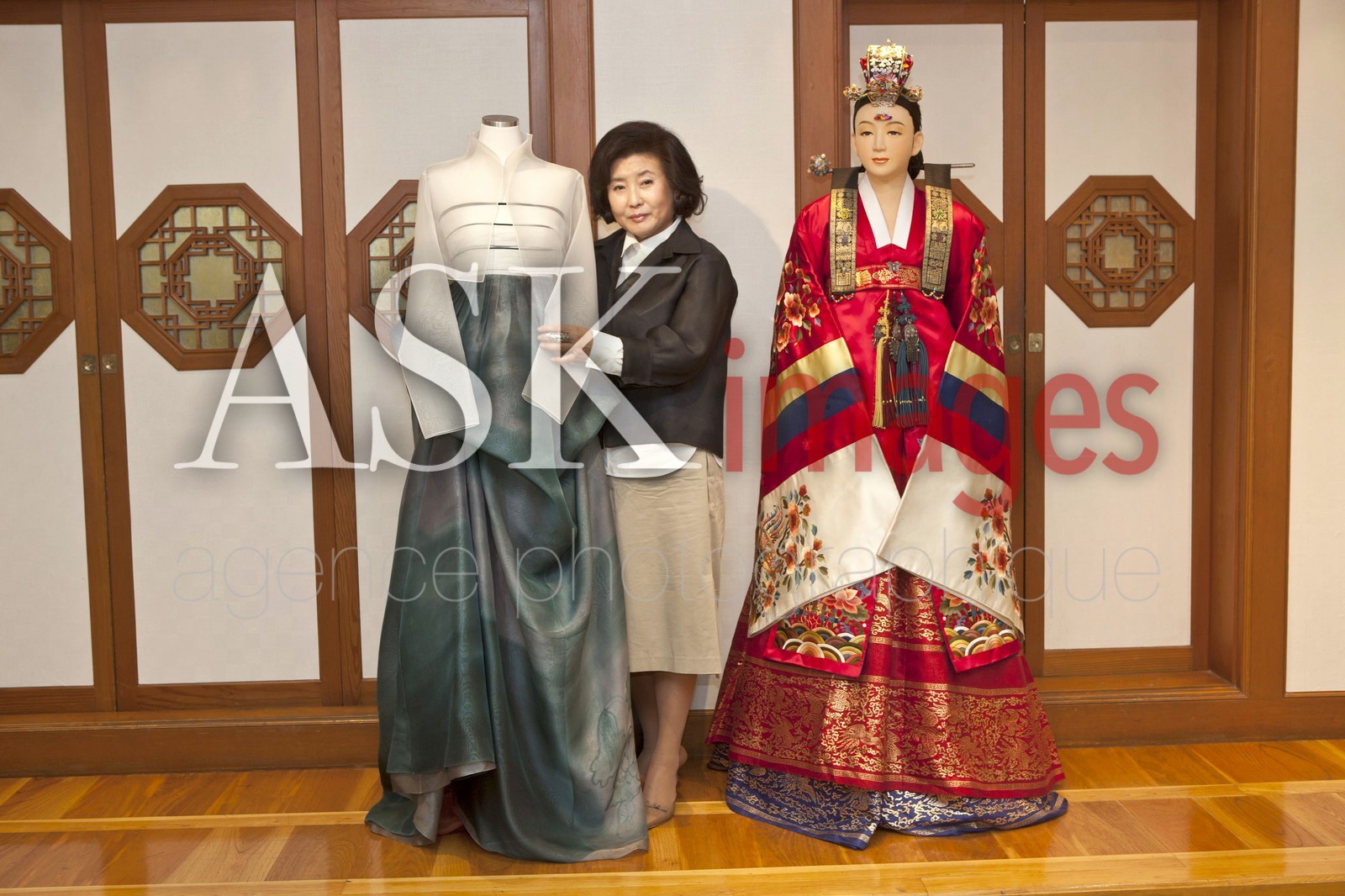 DescriptionSEOUL : COREE DU SUD *** Local Caption *** LEE YOUNG-HEE ,pretresse de la mode coréenne,entre un hanbok et sa version contemporaine