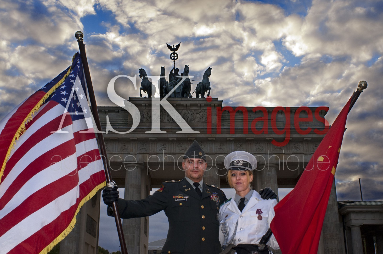| Description | Actors dressed as American and Soviet soldiers pose for photos with tourists in front of the Brandenburg Gate in Berlin, one of the Cold War's most iconic landmarks. |