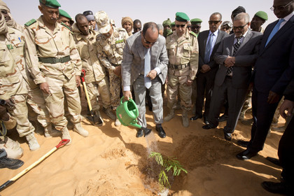 The president of Mauritania, Mohamed Ould Abdel Aziz visits the military base of Le Meye in mauritanian desert, the president is planting a flamboyant Mauritania, military base Le Mreye