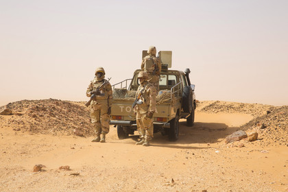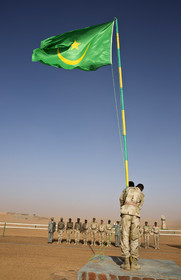 The president of Mauritania, Mohamed Ould Abdel Aziz visits the military base of Le Meye in mauritanian desert, rising flag Mauritania, military base Le Mreye