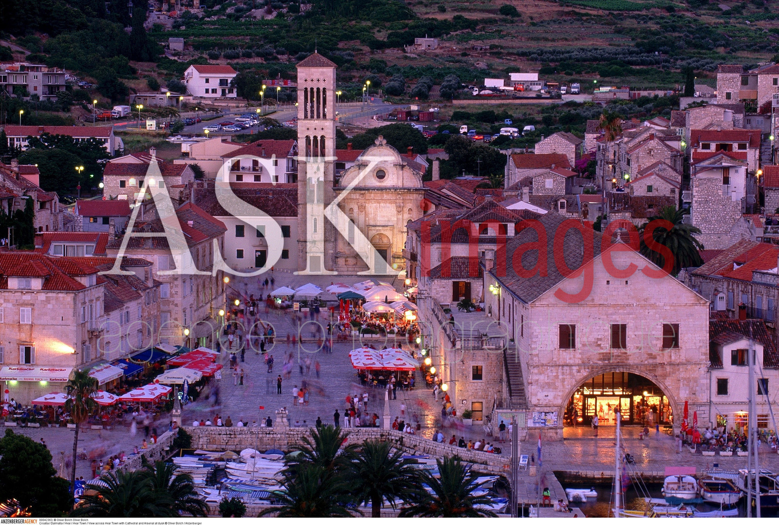 DescriptionCroatia / Dalmatia / Hvar / Hvar Town / View across Hvar Town with Cathedral and Arsenal at dusk..© Oliver Bolch / Anzenberger