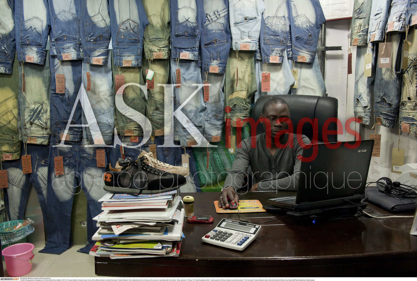 | Description | CHINA / Guangdong / Guangzhou / China's Little Africa / .In Yuexiu district's Xiaobei area, home of the African trader's market Overseas Traders Market. Here, Mohammed from Guinea in the shop he operates with his brother. Shop address 1F/shop 141 New Dengfeng Hotel ? selling jeans to African retailers and wholesalers. The Overseas Traders Market caters almost entirely to African merchants...© Philip Gostelow / Anzenberger |