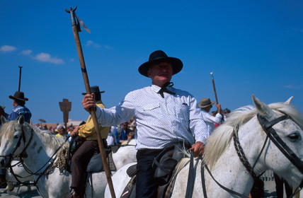 France, Camargue, Les Saintes Maries de la Mer, Gipsy festival in May, gardians (the cowherds).. Camargue, Provence, France