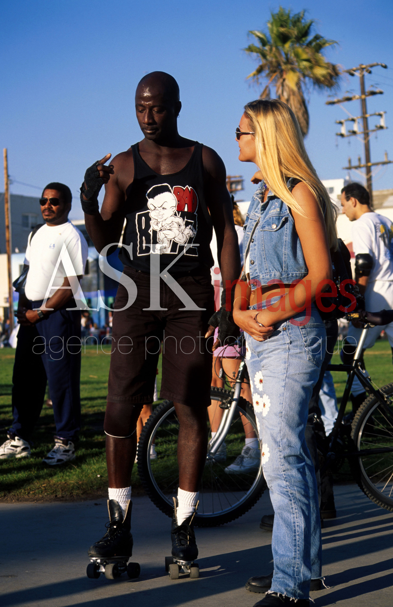 | Description | California, Los Angeles, Venice Beach, black man and white woman talking |