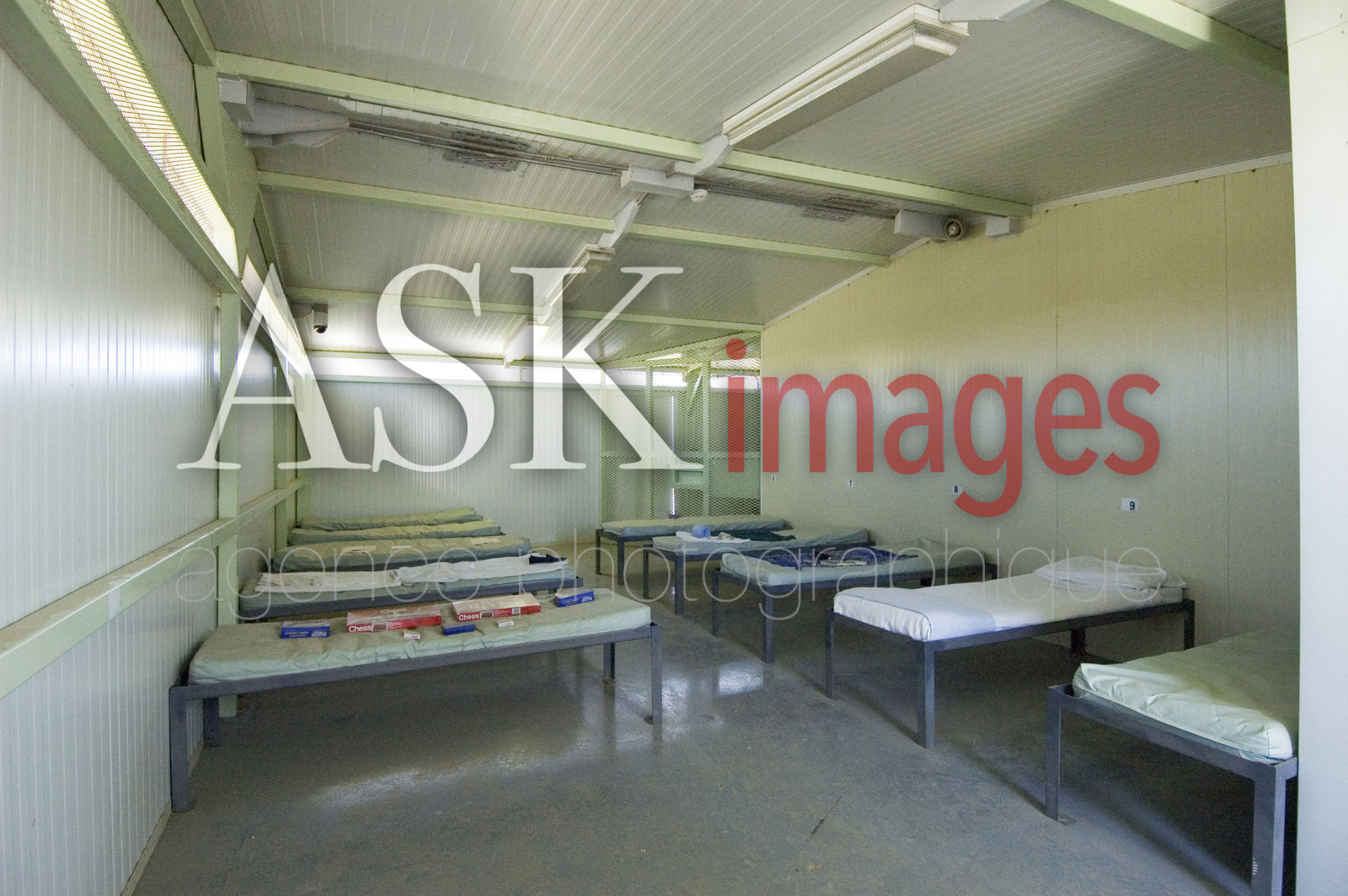 | Description | CUBA, Guantanamo, Group barrack, Mirrored with symmetrical unit, guard stands on far side of gated door and observes 10 men in each unit (20) simultaneously. |