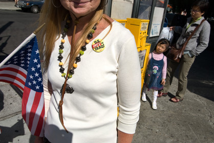 • USA, California, San Francisco. A woman is calling people to register in order to have the possibility to vote for the democratic's primaries which designed the new representative for the american presidency in the next year election.