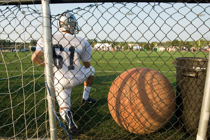 • USA, New Hampshire, Durham. Durham is the site of the New Hampshire University. A football player is doing some stretching before the training, near by a big training ball.