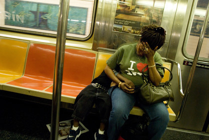 • USA, New York. A black woman with his son alone in desperation inside the subway, the boy is asleep and she hold his hands.
