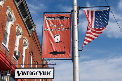• USA, Iowa, Riverside. The flag which indicate the future place of birth of captain Kirk from the tv series Startrek , due this the little town in Iowa is hosting many tourist and also once a year a celebration of Startrek where many fans coming dressed up as they idols.