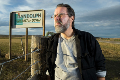 • USA, Utah. Randolph. Gage Slusser near by the welcome sign of his little town in Utah called Randolph, The little town is famous as 95 per cent of the people voted for Bush during the 2004 election, Gage was of the few who did not vote for Bush. Gage is the postman of the little town, he lives with his wife and two children.