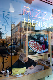 • USA, California, San Francisco. Woman in a restaurant near by an advertising of a man holding a pizza, in la Mission latino's district .
