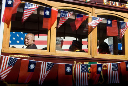 • USA, San Francisco, China town. During the china day (day of taiwan independence from China) a chinese man is inside an old streetcar with american and tawainese flags.