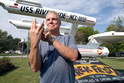 • USA, Iowa, Riverside. The Mayor of Riverside Bill Poch doing the typical gest of the fi'ger posing in front of the spaceship of TV series "Startrek' is posed in a little park of Riverside where they believe that Captain Kirk will born in 2228.