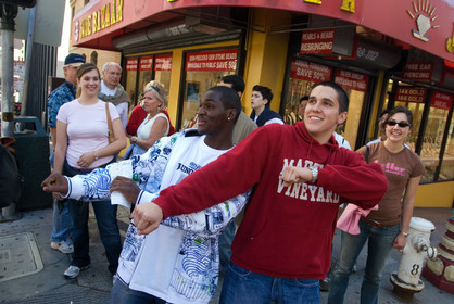 • USA, California, San Francisco. Students from Stanford university dancing on the street of China Town.