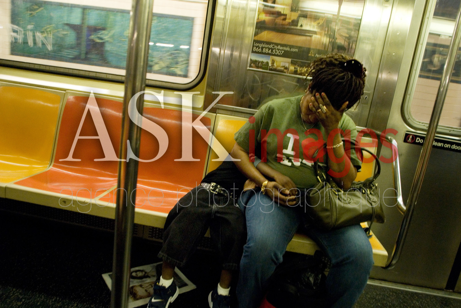 | Description | USA, New York. A black woman with his son alone in desperation inside the subway, the boy is asleep and she hold his hands..... |