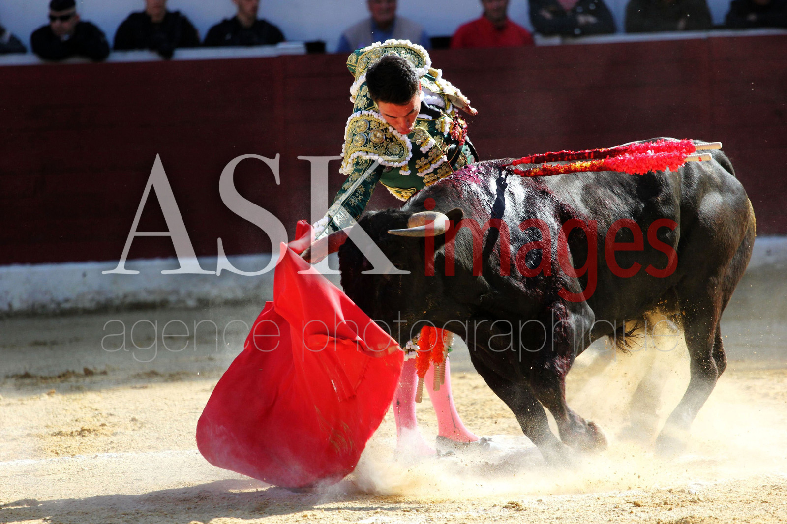 | Description | europe, france, aquitaine, landes, air sur l adour, le jeune matador, manolo vanegas pendant les novilladas de la madeleine de aire sur l adour, qui realise des passes sur un taureau de trois ans qui pese tout de meme 500 Kg, les banderilles sont planter dans le taureau |