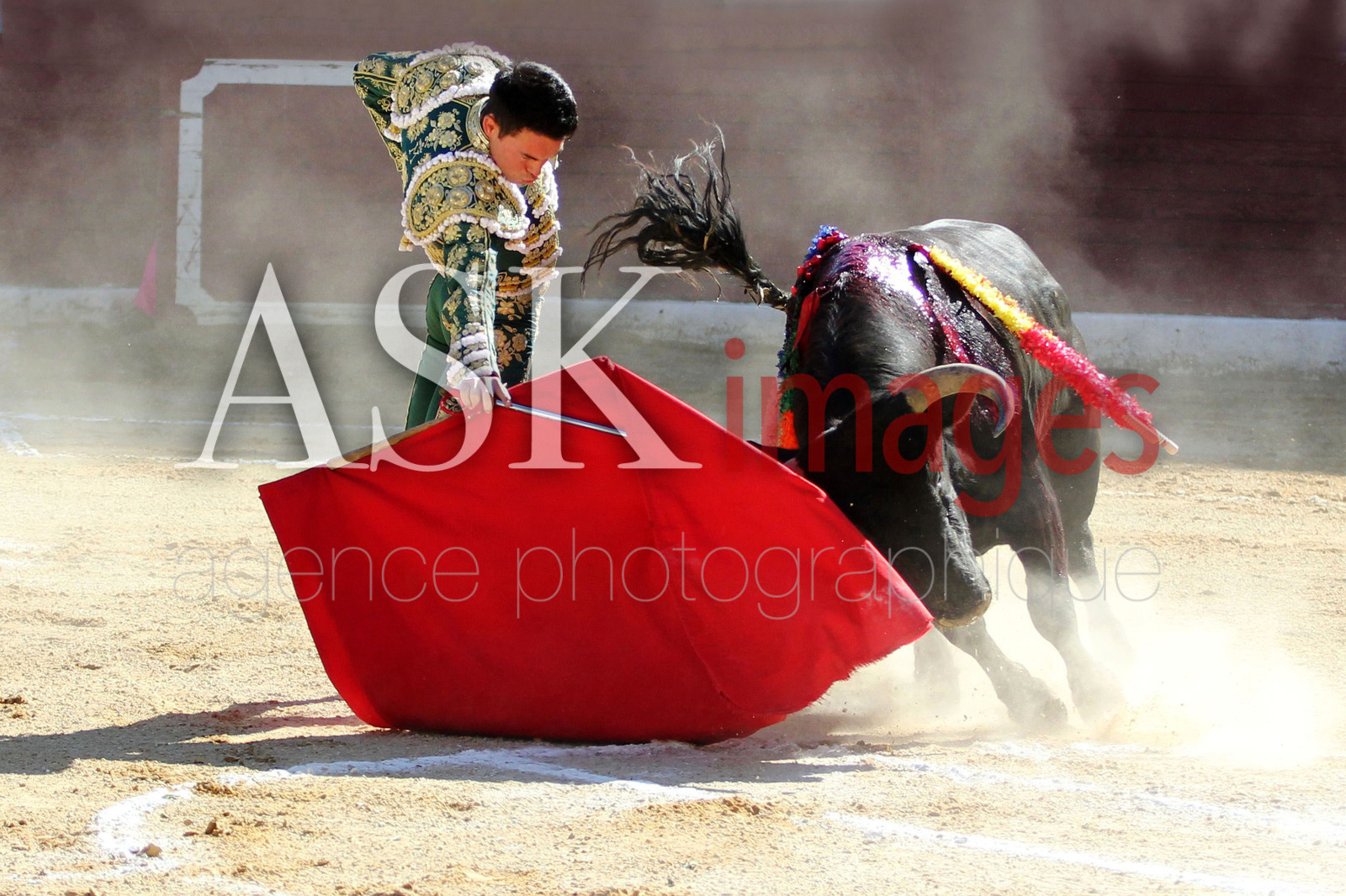 | Description | europe, france, aquitaine, landes, air sur l adour, le jeune matador, manolo vanegas pendant les novilladas de la madeleine de aire sur l adour, qui realise des passes sur un taureau de trois ans qui pese tout de meme 500 Kg, les banderilles sont planter dans le taureau |