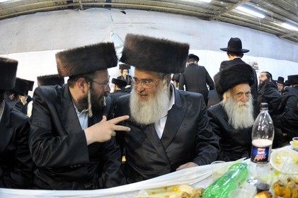 Hassidim in a sukka during sukkot holiday in Mea Shearim, Jerusalem.