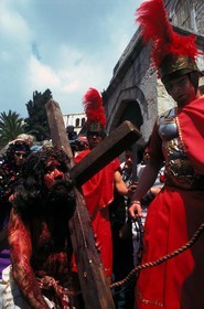 ISRAEL / Jerusalem /Good Friday / Easter.Reenactment of the Jesus final journey through the Via Dolorosa - the actor carries a wooden cross on his bare back. His face and body smudged with fake blood, and a crown of thorns on his head. Roman soldiers with red-plumed helmets push him forward.