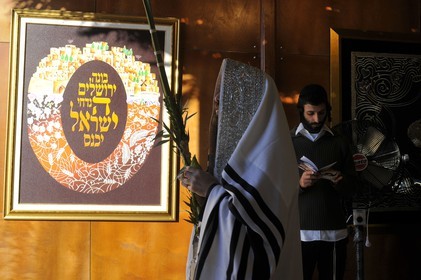 Hassidim praying in a sukkah near the kotel, Jerusalem .