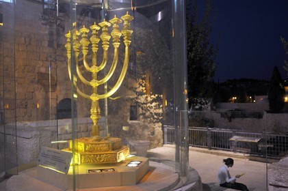 The menorah in the jewish quarter of the old city, a seven-branched candelabrum used in the Temple and now an emblem of Judaism, Jerusalem.