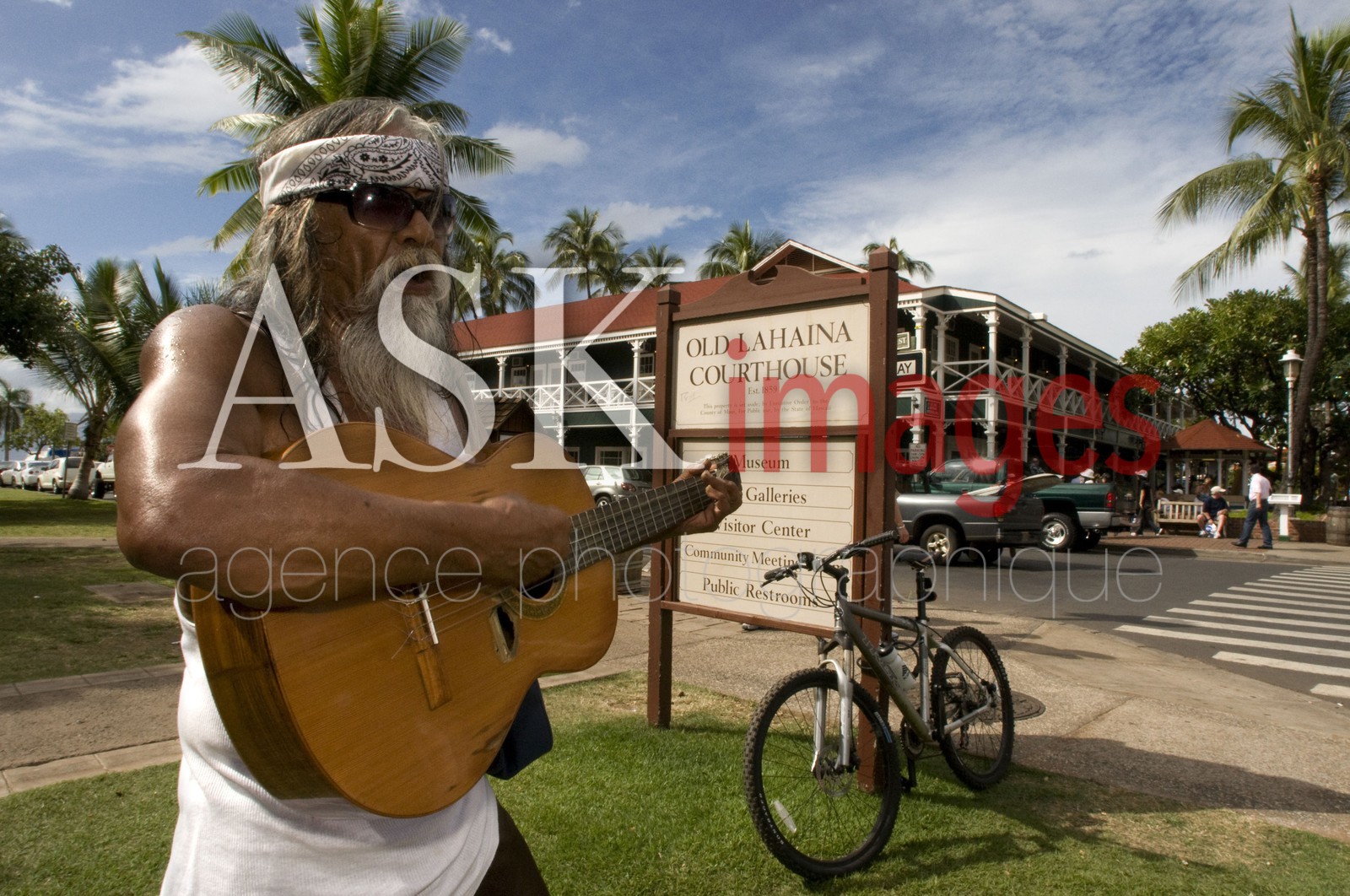 | Description | Hippye Playing guitar near the emblematic and ancient building Court and Prison of Lahaina. Maui. Hawaii. From its opening fanfare in 1860, the Lahaina Courthouse served as a customs house for whaling and trade ships as well as a center for government offices and court functions during the Monarchy period. |