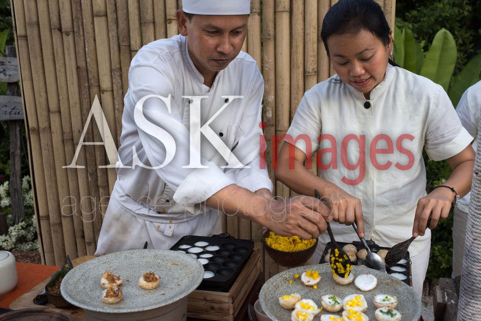 | Description | Six Senses Resort, Koh Yao Noi, Phang Nga Bay, Thailand, Asia. Cooker doing a Khanom Krok, coconout custard dessert. |